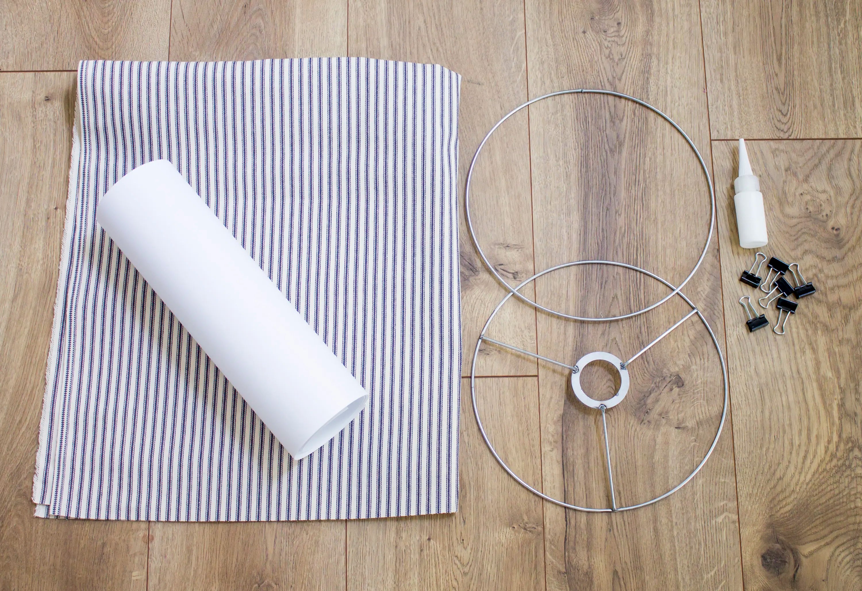 - Use clips to fix the fabric on the lamp ring, and glue the lampshade rings with the fabric